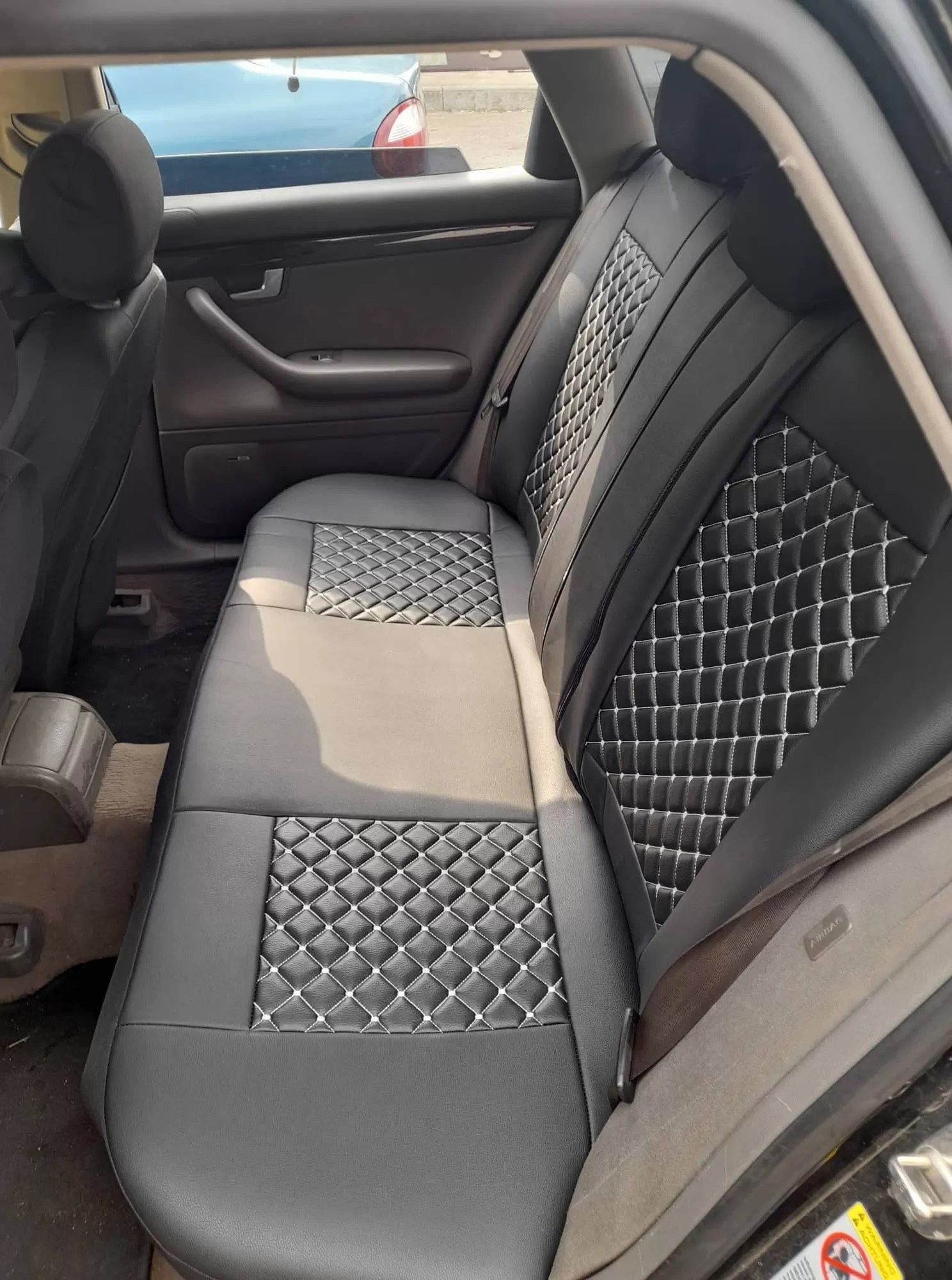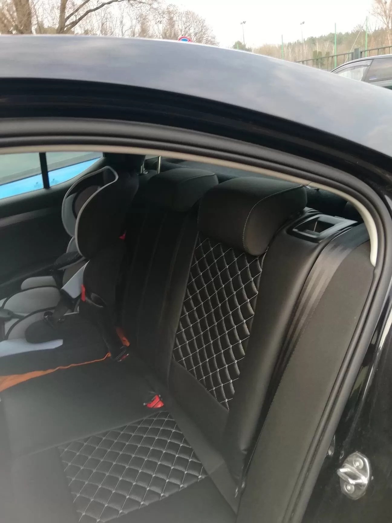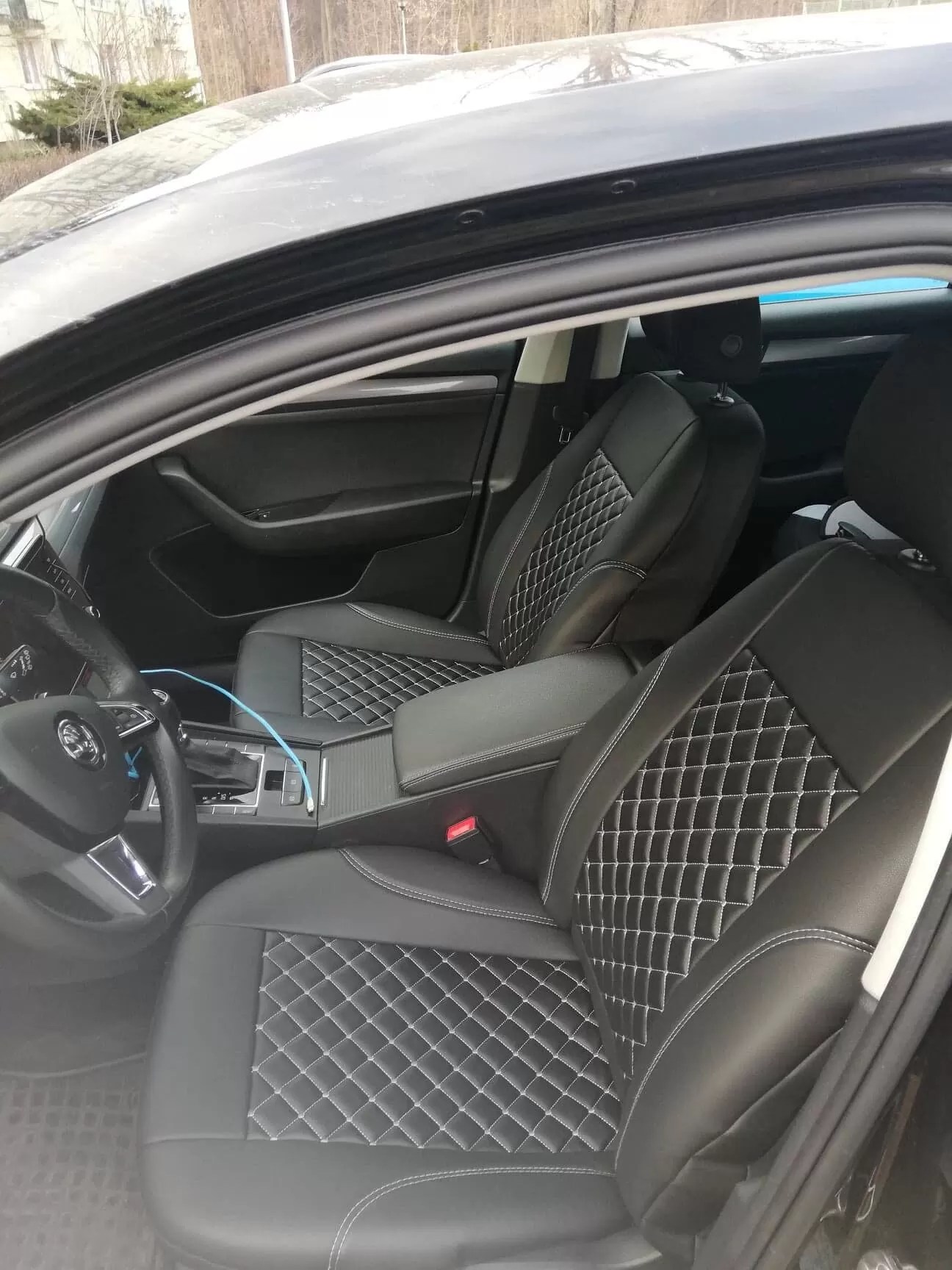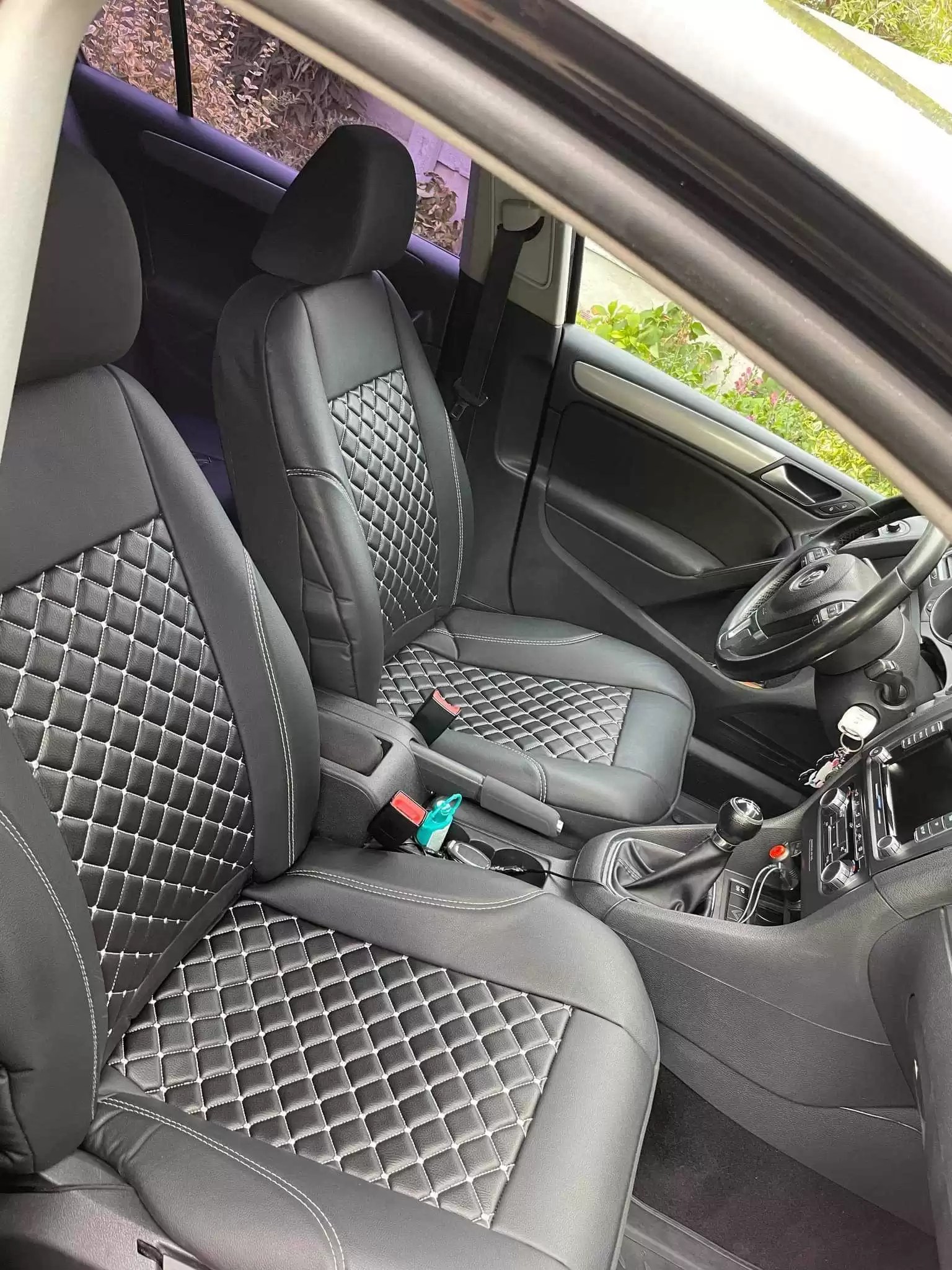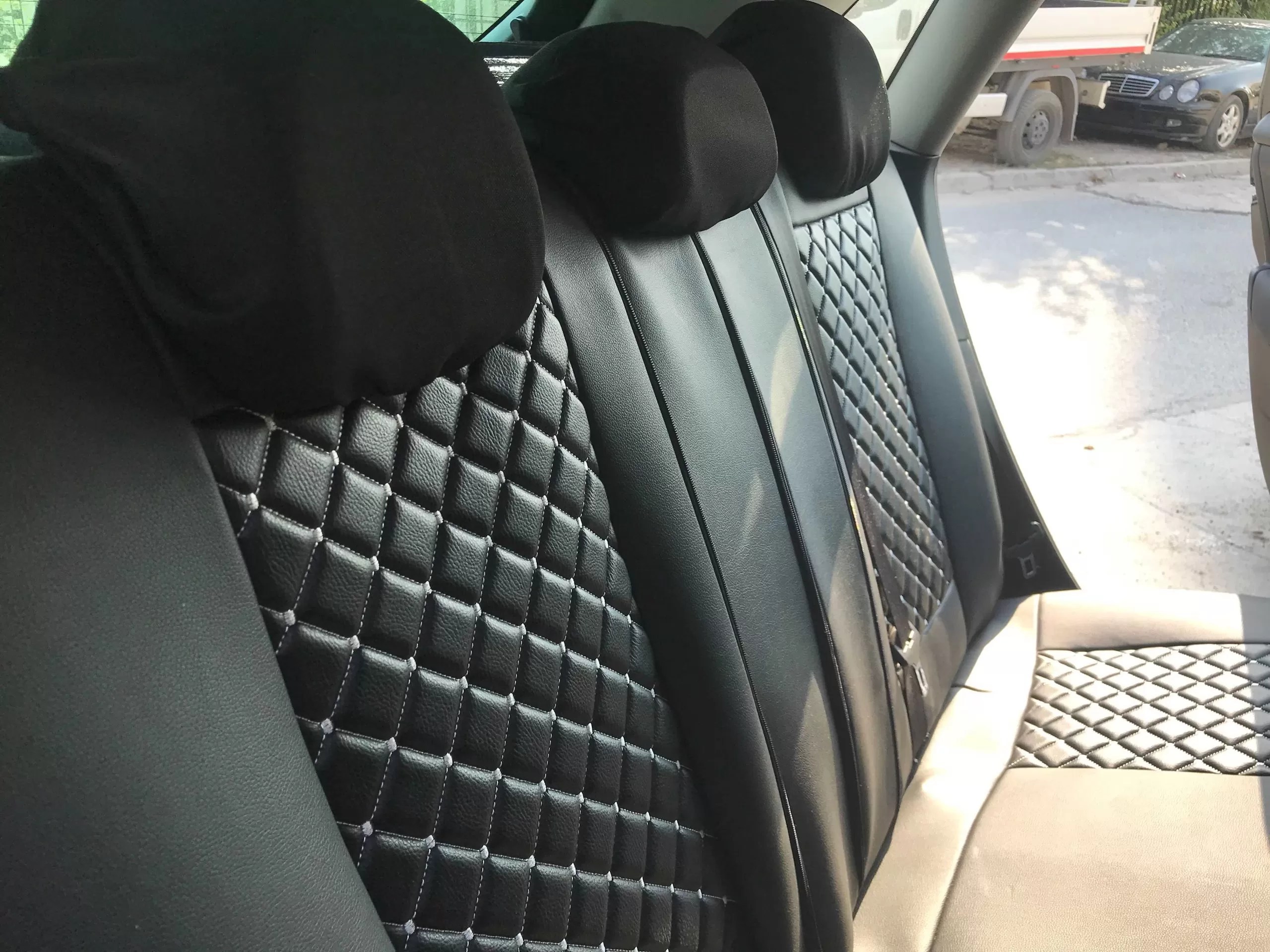 Üléshuzatok kiváló minőségű fekete műbőr autóipari ökobőrből és csúcsminőségű varrott ökobőrből, középen fehér szálakkal.
